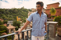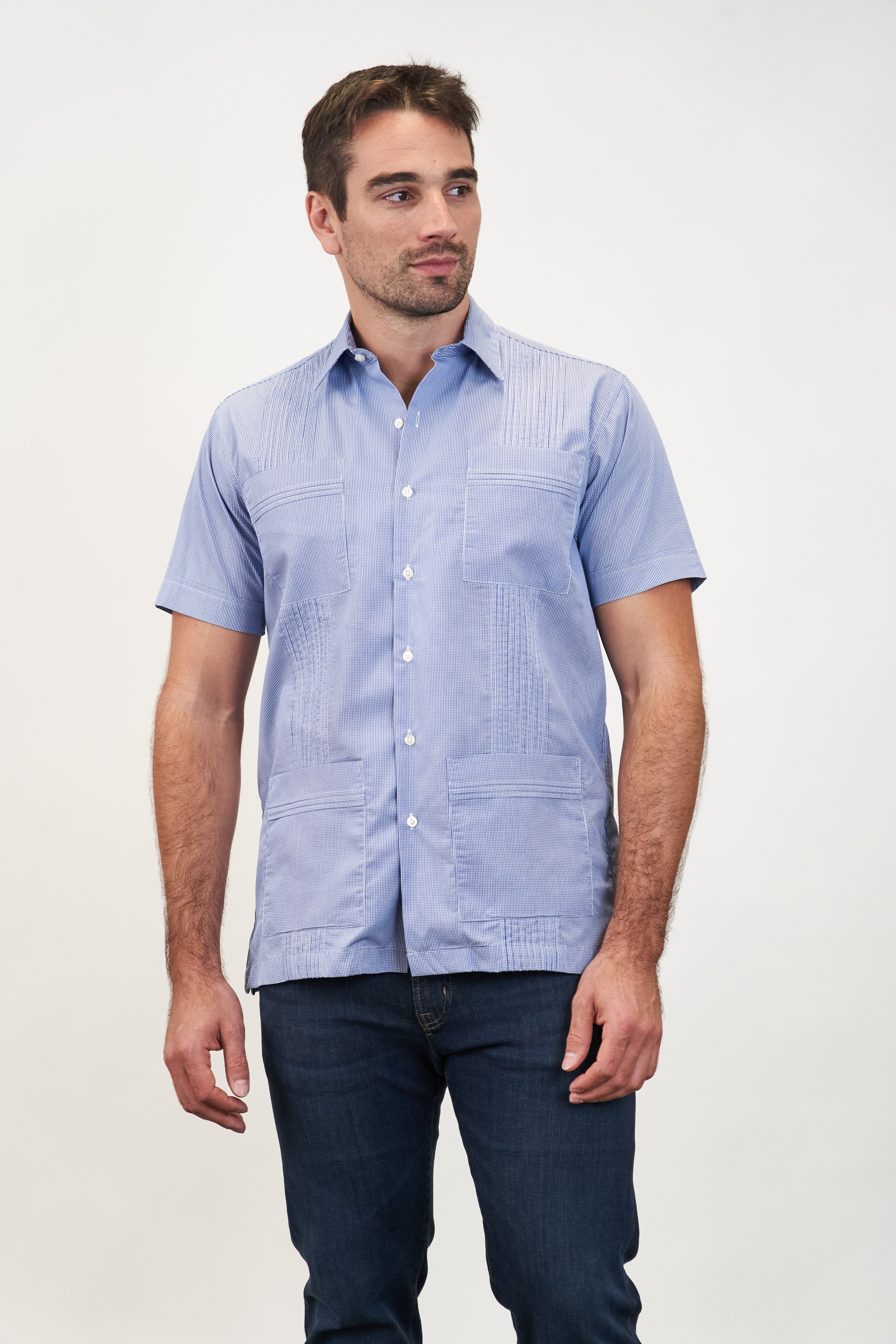 San Cristobal’s El Jefe Guayabera offers an authoritative take on this casual look. This version does not have embroidery, but features additional front vertical pleating, four pockets and the same cut and fit of the Hemingway (with a little less flair).