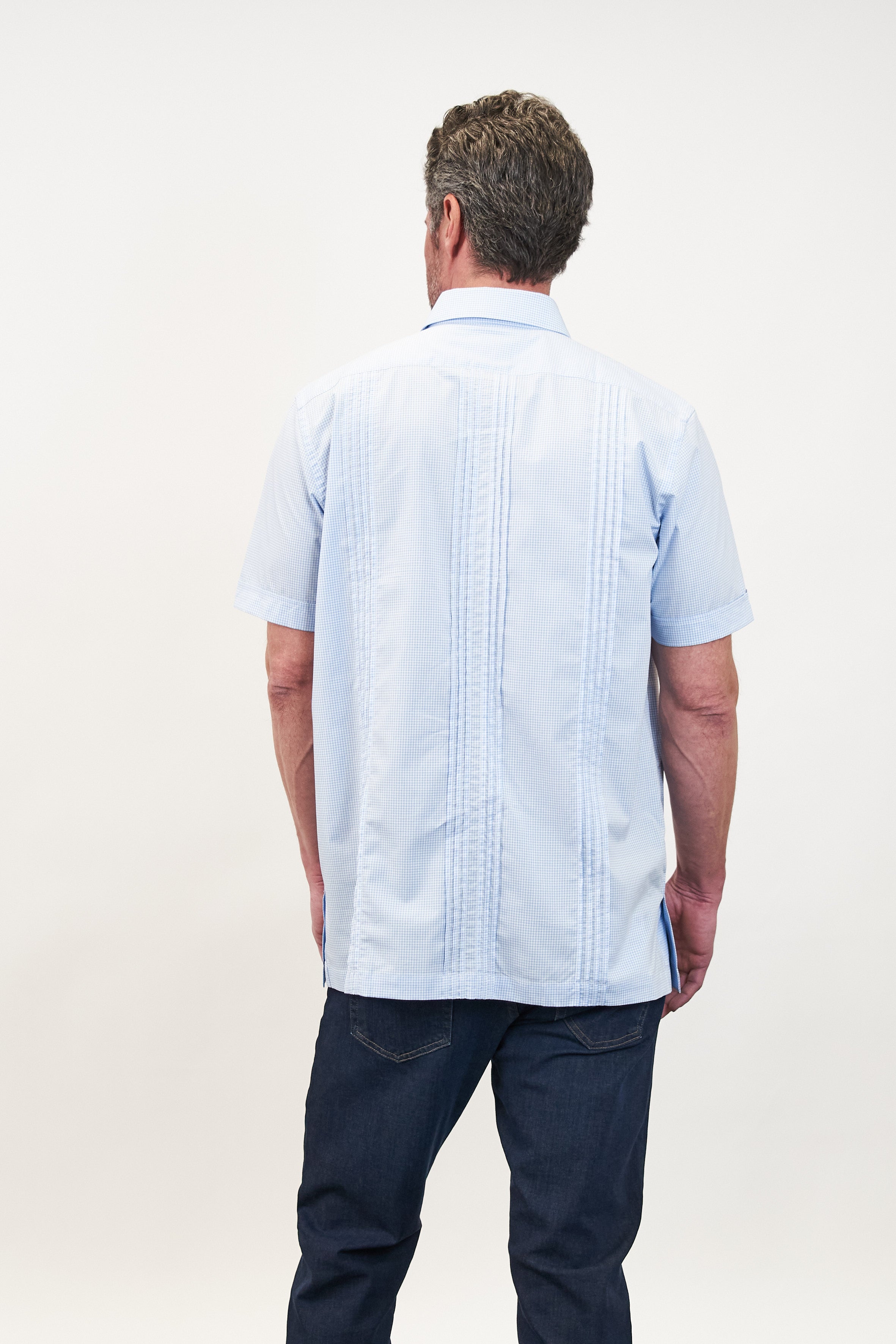 Blue Gingham 100% Cotton Short Sleeve Guayabera Shirt with Slate and Light Blue Embroidery