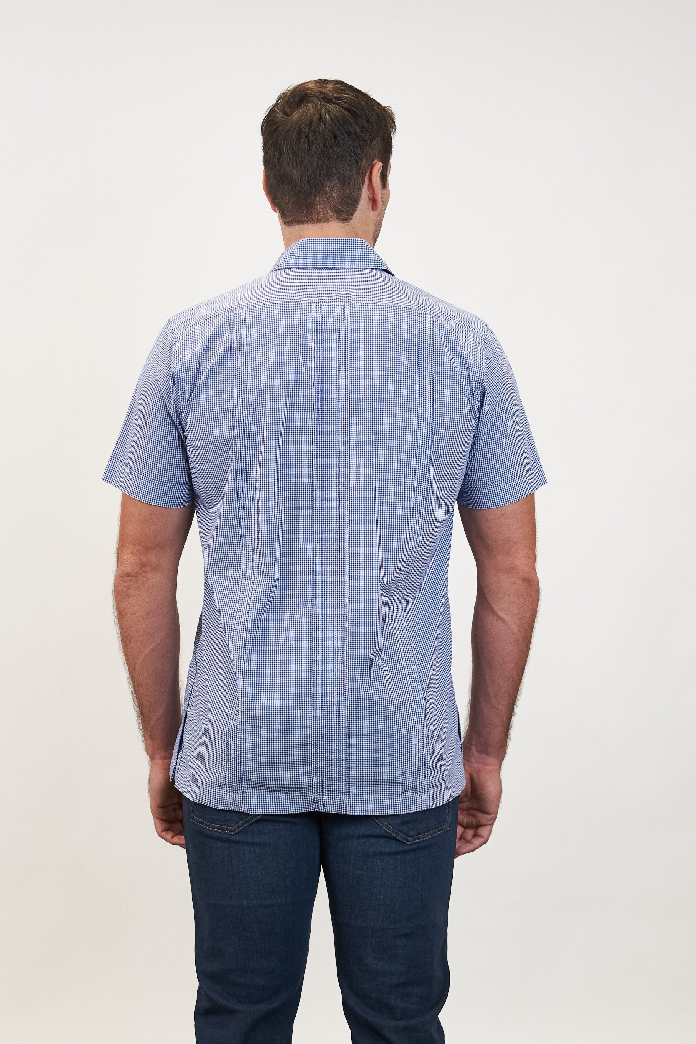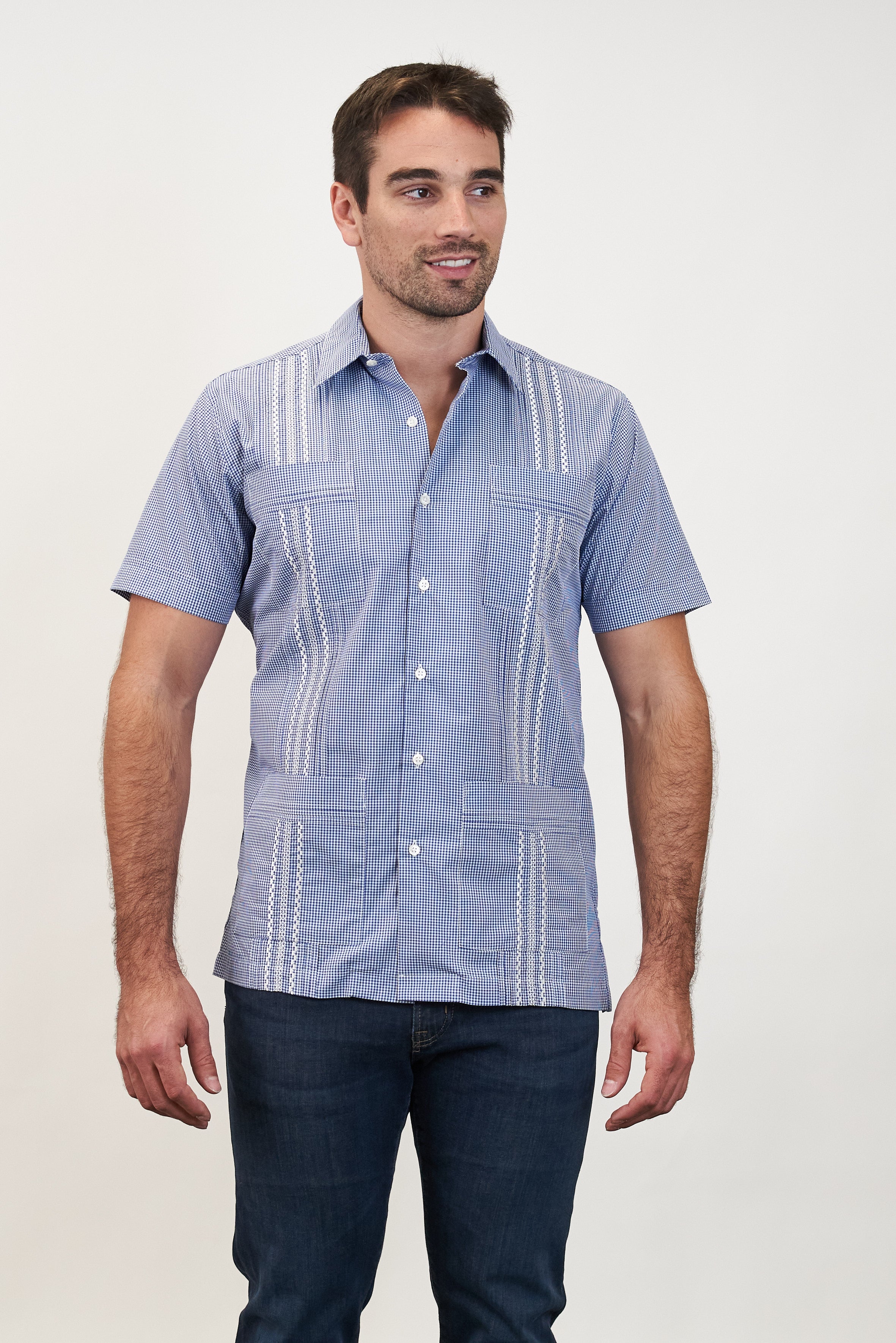 Blue Gingham 100% Cotton Short Sleeve Guayabera Shirt with White Embroidery